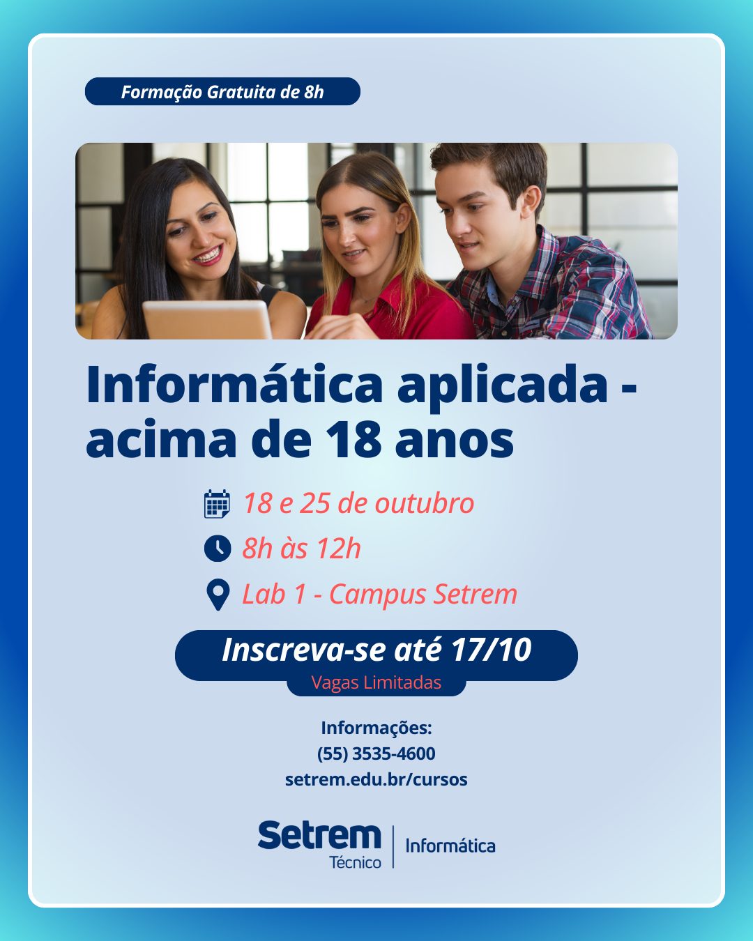A Setrem está com inscrições abertas para o curso Informática Aplicada, destinado a participantes acima de 18 anos. O objetivo é capacitar no uso das principais ferramentas tecnológicas, proporcionando conhecimentos essenciais de forma prática e acessível.