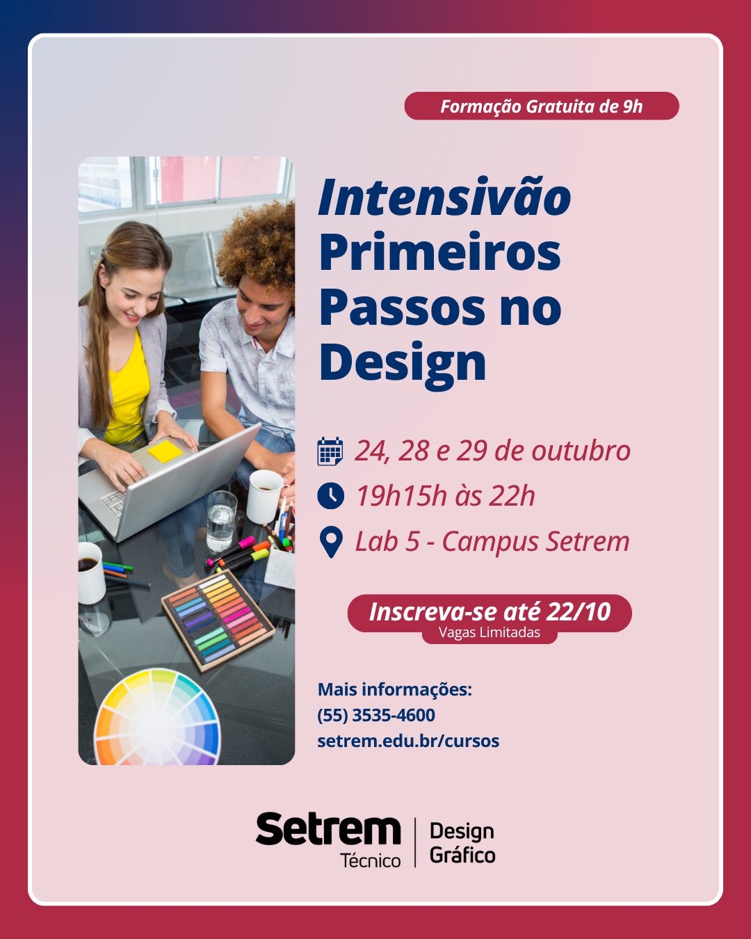 A Setrem está com inscrições abertas para o Minicurso: Primeiros Passos para Ingressar no Design Gráfico como Profissão, organizado pelos estudantes do Curso Técnico em Design Gráfico. A proposta é voltada a quem deseja iniciar sua jornada no mundo do design de forma prática, leve e descomplicada.