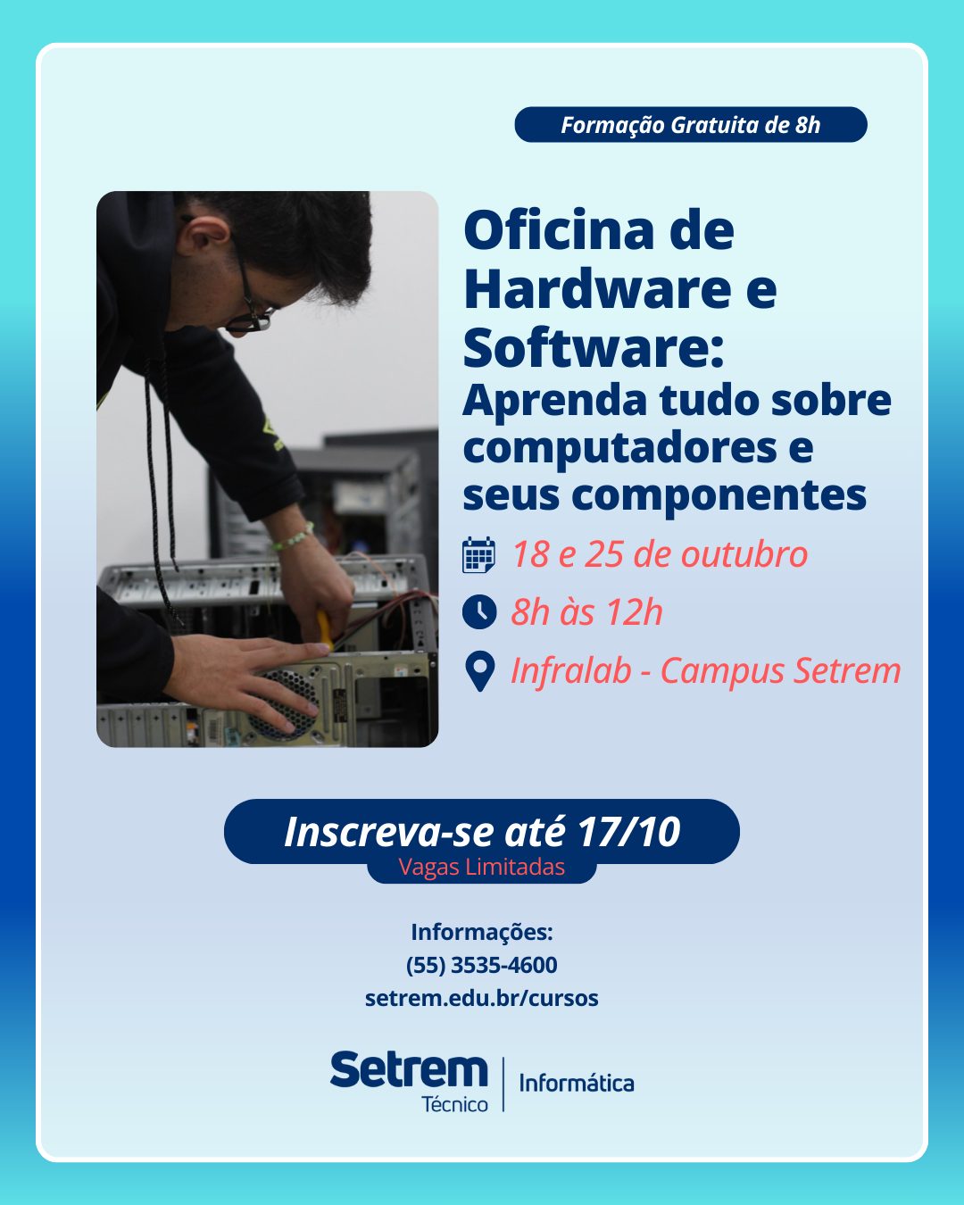 A Setrem está com inscrições abertas para a Oficina de Hardware e Software: Aprenda tudo sobre computadores e seus componentes, voltada à comunidade em geral. O objetivo é capacitar os participantes no entendimento do funcionamento dos computadores e de seus principais componentes, além de proporcionar prática em montagem e desmontagem de máquinas.