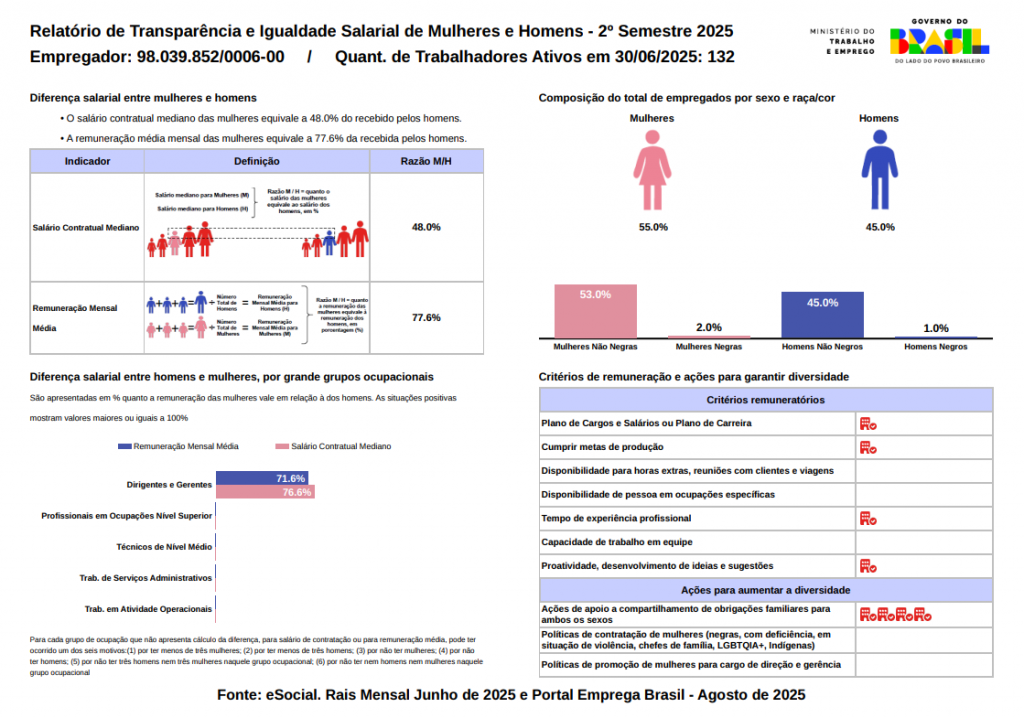 A Setrem, em conformidade com a legislação vigente sobre igualdade salarial entre mulheres e homens, torna público o Relatório de Transparência Salarial da unidade de Ensino Superior, referente ao 2º semestre de 2025. O documento foi elaborado com base nos dados oficiais do eSocial, RAIS e Portal Emprega Brasil, atendendo aos requisitos legais e reafirmando o compromisso da instituição com a transparência, a equidade de oportunidades e a justiça remuneratória.